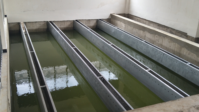 水的流動由水平方向進入沉淀池,進水區(qū)主要為穿孔墻、槽壁及下流斜管入水,使水流均勻分布在池寬方向,其要求及規(guī)劃安排與平流式沉淀池相同。為使上向流斜管均勻地流出,必須在斜管下面堅持一定的配水區(qū)高度,使進口斷面處的流速不大于0.02~0.05m/s。