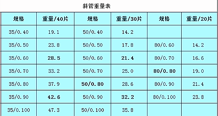 首先以我們常見的聚丙烯材質(zhì)斜管填料為例子,聚丙烯材料的標(biāo)準(zhǔn)密度為920kg/m?。通常的斜管單片尺寸為1000*1000mm,延展為標(biāo)準(zhǔn)方形需求乘以1.3的比例。我們便可以根據(jù)斜管的片數(shù)和厚度計算出標(biāo)準(zhǔn)重量。例如直徑50mm斜管填料,厚度為0.5mm。每立方為30片,那么我們就可以計算得到0.0005*30*920*1.3=18kg。消費運用中經(jīng)常用到的三種直徑規(guī)格35mm/50mm/80mm每立方的標(biāo)準(zhǔn)片數(shù)分別為40/30/20片。大家就可以根據(jù)這個基本計算方式推算出斜管填料標(biāo)準(zhǔn)重量。需求指出的是,計算采用的是全新聚丙烯原料的標(biāo)準(zhǔn)密度數(shù),沒有運用全新料或者原料種類不同者不在討論范圍之內(nèi)。下面為整理的參數(shù)表可以作為參考: