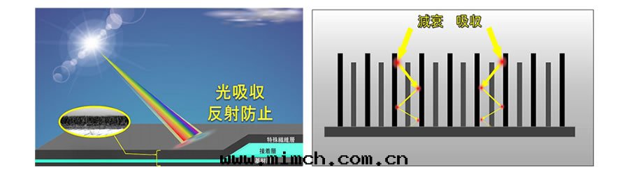 所(suǒ)有(yǒu)角度(dù)的(de)光線(xiàn)在(zài)特(tè)殊的(de)纤維間(jiān)衰減·被吸收(shōu),從紫外(wài)線(xiàn)~可(kě)視光~到紅(hóng)外(wài)線(xiàn)的(de)波域中(zhōng),光線(xiàn)被高(gāo)效吸收(shōu),防止産生(shēng)反(fǎn)射。![]() |