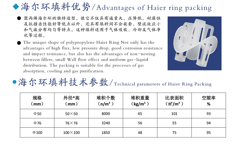 產(chǎn)品介紹 聚丙烯海爾環(huán)填料是用聚丙烯注塑成型的一種新型開孔填料,它最早是在國外被開發(fā)出來的。后來我國對這種填料進(jìn)行了研究,并且成功的地開發(fā)出國產(chǎn)海爾環(huán)填料。